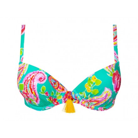 Soutien-gorge en maille imprimé. Bonnets drapée. Bijoux pompon à l'entre gorge.