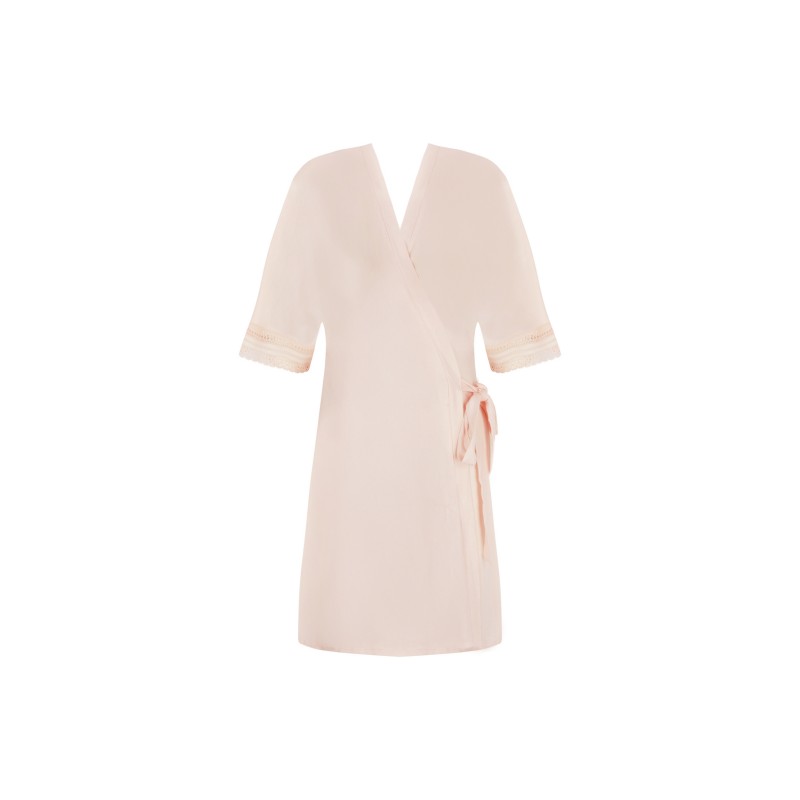 Déshabillé en maille unie avec incrustation d'un galon dentelle en bas de manches. Ceinture.