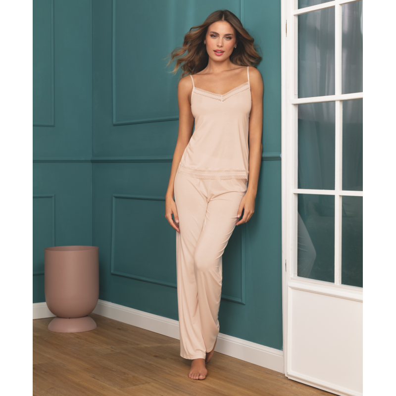 Top à fines bretelles. A porter en dessus-dessous.Caraco en maille unie avec incrustation d'un galon dentelle en décolleté devant et en bas de corps. Nœud au milieu devant. Bretelles réglables.