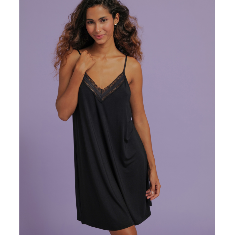 Nuisette à bretelles fines légèrement évasée sur le bas. Longueur dessus genou.