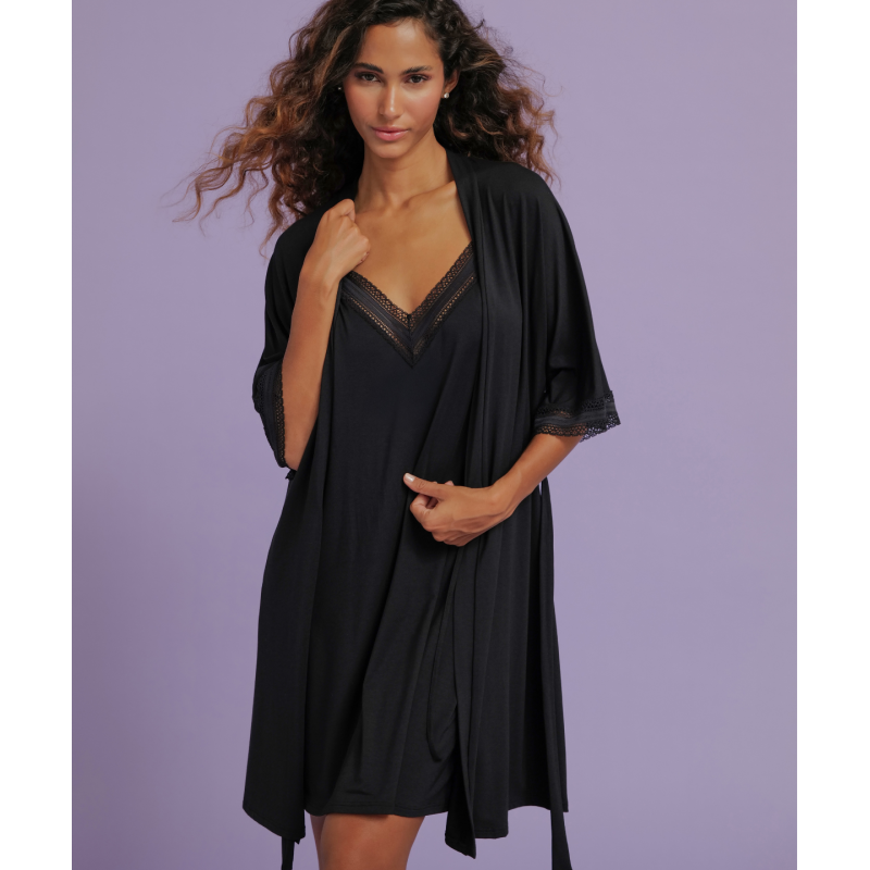 Déshabillé en maille unie avec incrustation d'un galon dentelle en bas de manches. Ceinture.